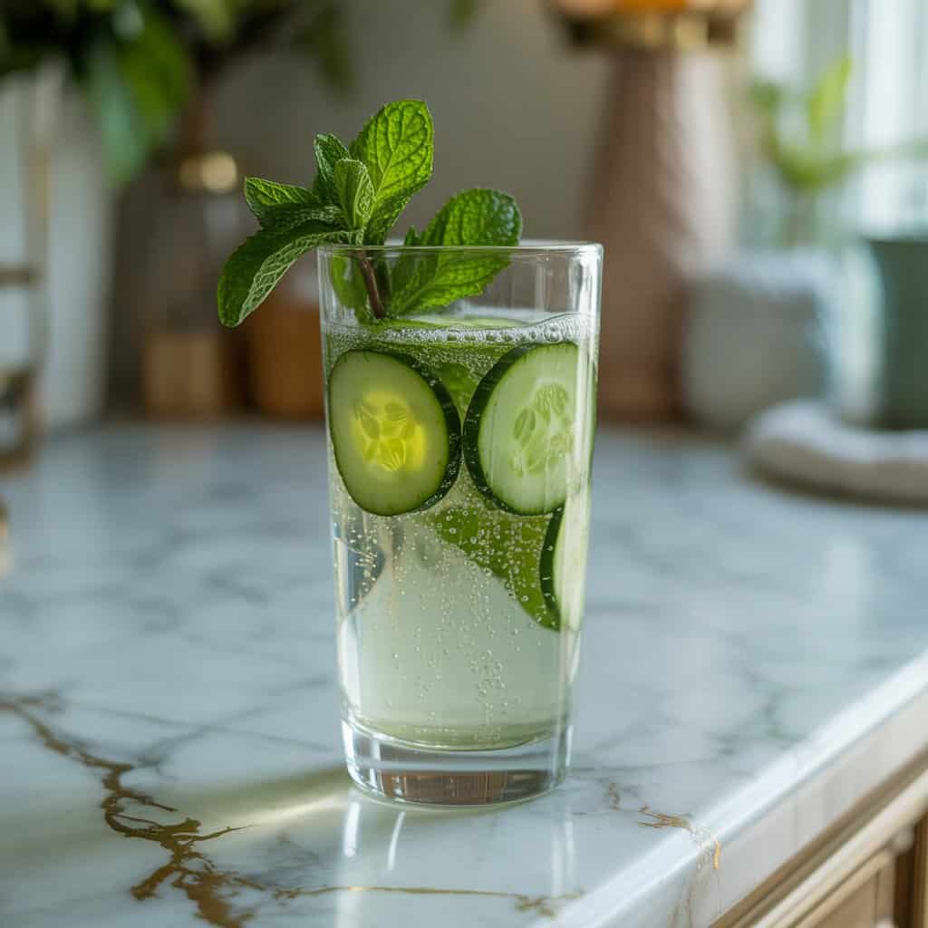 Tall glass, extra cucumber, and a sprig of mint on top—suddenly it looks like something from a fancy bar.