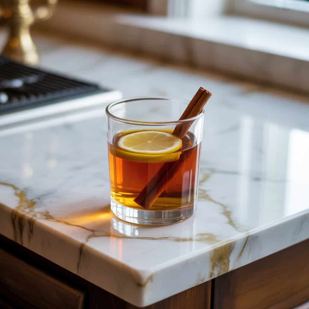 A cinnamon stick works as a stirrer, and whole cloves add aroma without taking over the drink. I avoid boiling water because it turns the lemon bitter—trust me, not great.