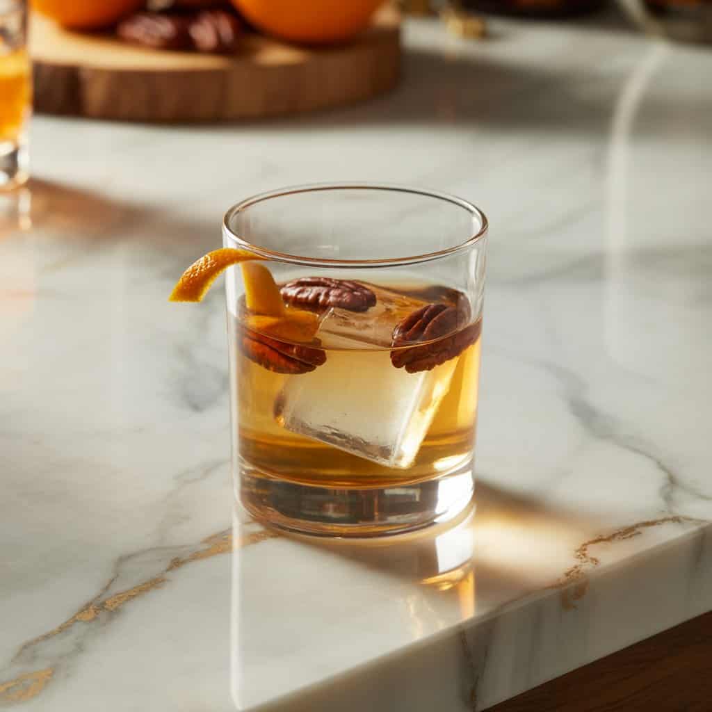 - Express a strip of citrus peel over the drink and drop it in as garnish. Add a few roasted pecans for aroma and crunch if desired.