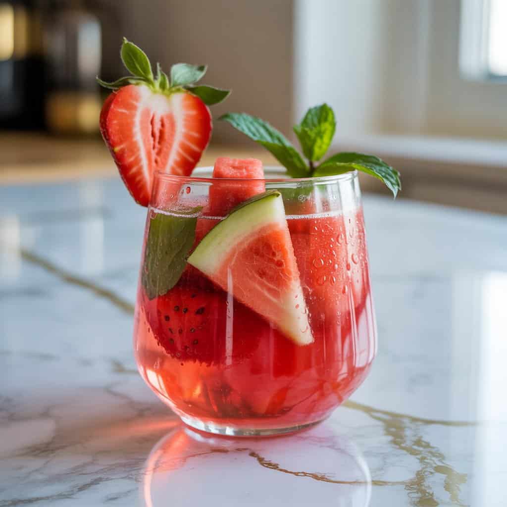 I like this drink because it blends fresh fruit with light flavors that just stay refreshing. Sweet watermelon and tangy strawberries make a cooler that’s great for warm days and honestly, it’s really easy to whip up at home.